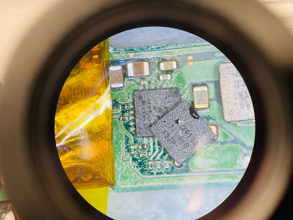 交換後、電源を入れてみましたが、まだ起動がしない状態でしたので、更に検査を進めていくと充電ICもショートしていたので、そちらも交換していきます。