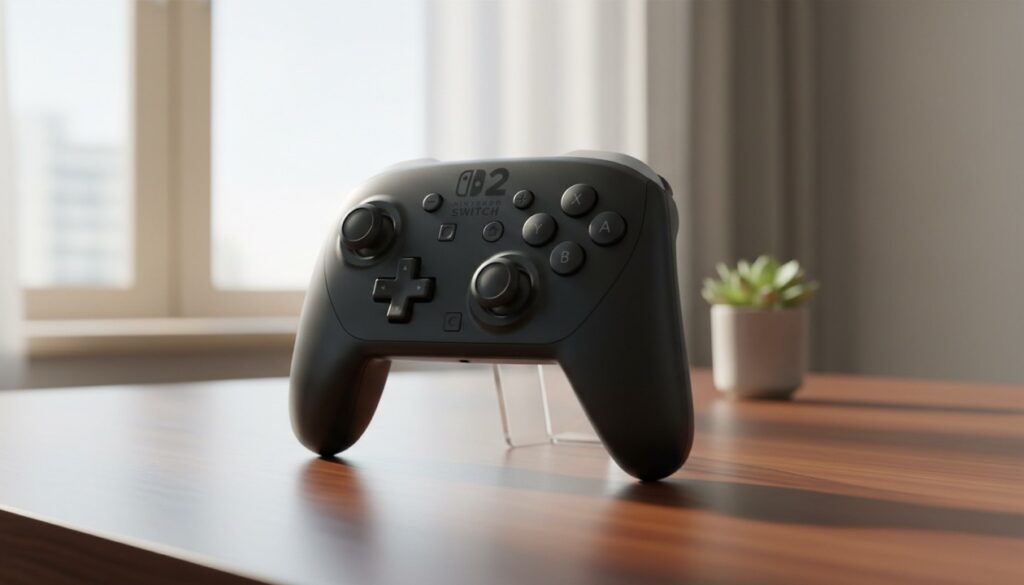 Switch 2本体をテーブルモードで立てるか、別売りのスタンドで自立させて、ワイヤレスで接続する形になります。本体に物理的に装着することはできませんが、外出先でも旧プロコンの操作感でプレイできます。